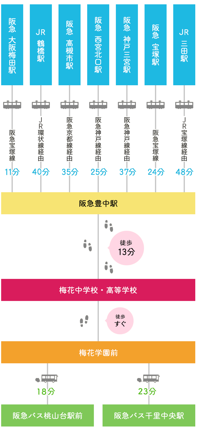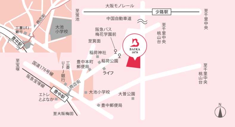 北大阪急行電鉄『千里中央駅』より阪急バス約23分。「梅花学園前」下車すぐ。
