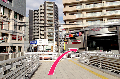 矢印方向に進むと左手に歩道橋が見えてきます。