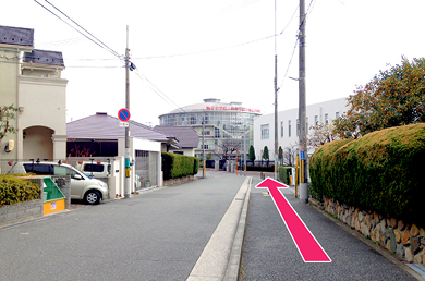 梅花中学校・高等学校のシンボル円形校舎が見えてきます。約100mで正門に到着です。
