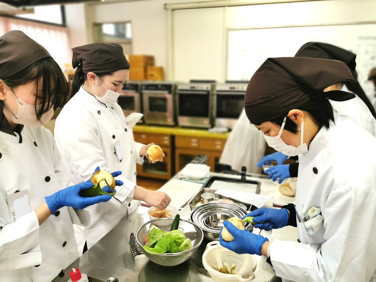 2年生になってから実習で取り組むメニューのバリエーションも増え、日常的な家庭料理や和・洋・中の料理。洋菓子・パンの基本について技術だけでなく理論についても学びます。