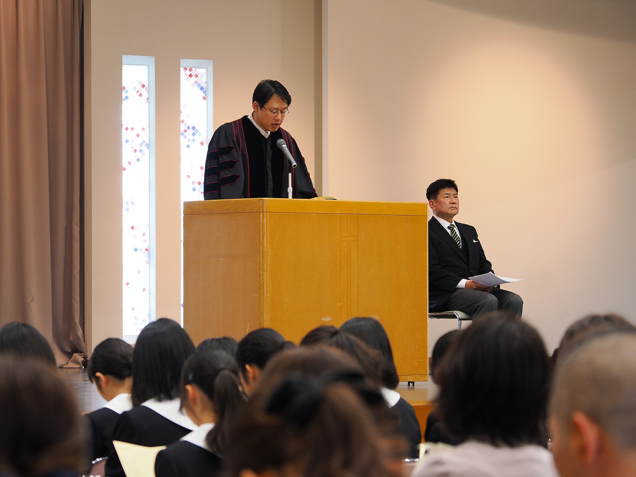入学礼拝はオルガン前奏に始まり、讃美歌斉唱、宗教部長による聖書朗読、祈祷と礼拝形式に則ってすすめられます。