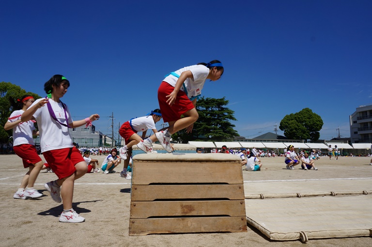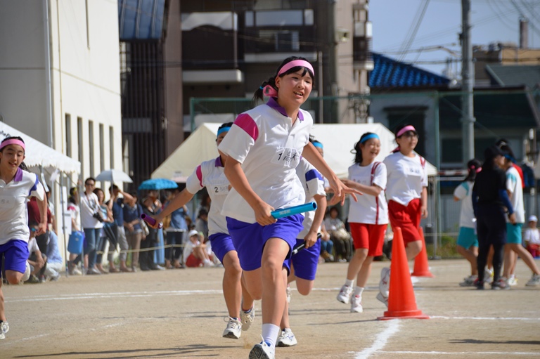 中学生は水色・桃色、高校生は赤・青・黄・緑に学年を超えて分かれ、様々な競技の順位によって得点が入り、優勝を競う体育祭。