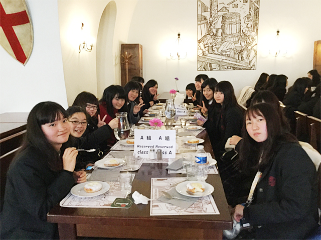 世界遺産の街並みを歩き、写真撮影に大はしゃぎしながら、昼食のレストランに向かいました。